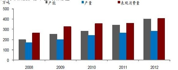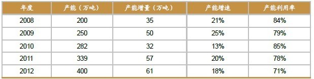 截至2012年底,我國主要合成橡膠的產(chǎn)能為400萬噸/年,同比增長了18%,相比2008年增長了1倍。由于產(chǎn)能擴(kuò)張迅速,供過于求現(xiàn)象日益嚴(yán)重,我國合成橡膠的產(chǎn)量增速明顯低于產(chǎn)能增速,合成橡膠裝臵的整體產(chǎn)能利用率從2008年的84%下降至2012年的71%。