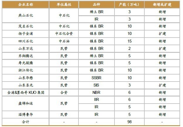 表2:2013年我國合成橡膠新增產(chǎn)能情況