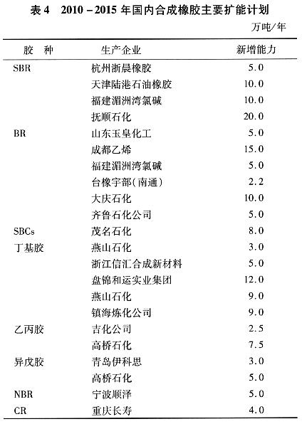 2010年以后,國內(nèi)還將有一批合成橡膠裝置投產(chǎn),預(yù)計(jì)國內(nèi)部分品種產(chǎn)能將略有過剩。同時(shí),民營企業(yè)將大量進(jìn)入合成橡膠領(lǐng)域,市場競爭呈多元化態(tài)勢。預(yù)計(jì)2010年和2015年,我國合成橡膠產(chǎn)能將分別達(dá)到292萬噸/年和405萬噸/年左右。主要擴(kuò)能計(jì)劃見表4。