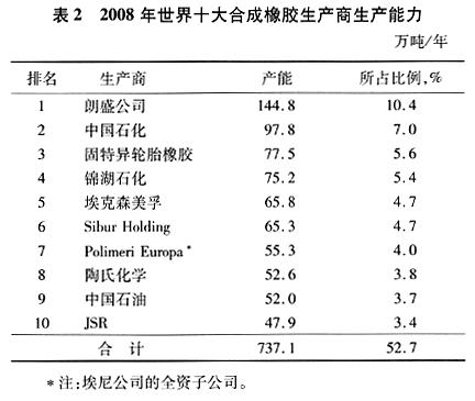 世界十大合成橡膠生產(chǎn)商依次為朗盛公司(按權(quán)益產(chǎn)能排位。僅考慮固體膠,不含特種橡膠和合成膠乳,下同)、中國石化集團(tuán)公司、固特異輪胎橡膠公司、錦湖石化公司、?松梨诨す、SiburHolding公司(西伯利亞烏拉爾石油天然氣公司)、PolimeriEuropaS.p.A.、中國石油天然氣集團(tuán)公司、陶氏化學(xué)公司和JSR公司(見表2)。