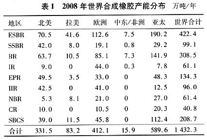 2008年底,世界合成橡膠(七大膠種及SBCs,不含膠乳,下同)的生產(chǎn)能力為1432萬噸/年,同比增長3.0%。當(dāng)年新增產(chǎn)能主要來自亞太地區(qū),主要是中國。