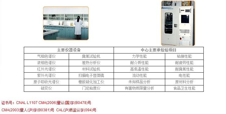 上海橡膠制品研究所檢測中心(上海市橡膠制品質(zhì)量監(jiān)督檢驗(yàn)站)、化學(xué)工業(yè)膠粘劑質(zhì)量監(jiān)督檢驗(yàn)中心是經(jīng)計(jì)量認(rèn)證及實(shí)驗(yàn)室認(rèn)可、在全國橡粘劑行業(yè)頗具影響的檢測實(shí)驗(yàn)室,承擔(dān)委托檢驗(yàn)、監(jiān)督檢驗(yàn)、仲裁檢驗(yàn)、認(rèn)證檢驗(yàn)、科技成果的檢測鑒定,并提供按GB、ISO、ASTM、DIN、BS、JIS等標(biāo)準(zhǔn)進(jìn)行橡膠、塑料和膠粘劑(帶)、密封膩?zhàn)拥犬a(chǎn)品檢測鑒定服務(wù),同時(shí)也提供相關(guān)的技術(shù)咨詢服務(wù)。多年來深得社會(huì)認(rèn)可,曾為多項(xiàng)重點(diǎn)工程建設(shè)(如地鐵、河流污水整治、機(jī)場、大眾汽車、通用汽車、電廠等)檢測。同時(shí)作為全國膠粘劑標(biāo)準(zhǔn)化技術(shù)委員會(huì),組織國家標(biāo)準(zhǔn)及行業(yè)標(biāo)準(zhǔn)的制(修)訂(如GB 18583《室內(nèi)裝飾裝修材料膠粘劑中有害物質(zhì)限量》)等。