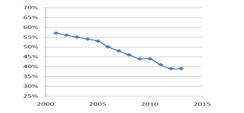我省輪胎行業(yè)主要產(chǎn)品品種是全鋼子午胎、半鋼子午胎、工程子午胎、巨胎、農(nóng)業(yè)子午胎、軍用特種輪胎和斜交輪胎等。近年來,我省輪胎產(chǎn)品結(jié)構(gòu)調(diào)整步伐明顯加快。半鋼子午胎和全鋼子午胎產(chǎn)量由2008年的4220萬條、3150萬條,分別上升到2013年的17900萬條和6228萬條,兩者比例也由 1.34:1調(diào)整到2.87:1。輪胎子午化率由2008年的62%上升到2013年的85%(見表二、圖二),并且高性能、低斷面、超低斷面、高速度級別的半鋼子午胎以及無內(nèi)胎全鋼子午胎比例明顯提高,骨干企業(yè)中三角、玲瓏的以上產(chǎn)品比例已達到50%以上。其中,通過美國SmartWay認(rèn)證和達到歐盟REACH法規(guī)及歐盟標(biāo)簽法要求的“綠色輪胎”5000萬條左右,約占全省子午線輪胎總量的20%。