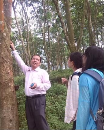 農(nóng)場的掛職鍛煉生活是充實的。在農(nóng)場領(lǐng)導(dǎo)的帶領(lǐng)下,我們?nèi)齻小組的教師都深入生產(chǎn)一線,了解橡膠樹的種植、生產(chǎn)和管理等基本情況。通過農(nóng)場領(lǐng)導(dǎo)的介紹,我們不僅了解到種植橡膠樹的樹間距的選擇以及病蟲害防范的注意事項,也了解到橡膠中小苗如何進行科學(xué)管理,還了解到如何通過陰刀、陽刀的割膠技術(shù),來提高橡膠樹的利用率以增加產(chǎn)量。對于我們提出的疑問,農(nóng)場領(lǐng)導(dǎo)都耐心地一一給予解答。